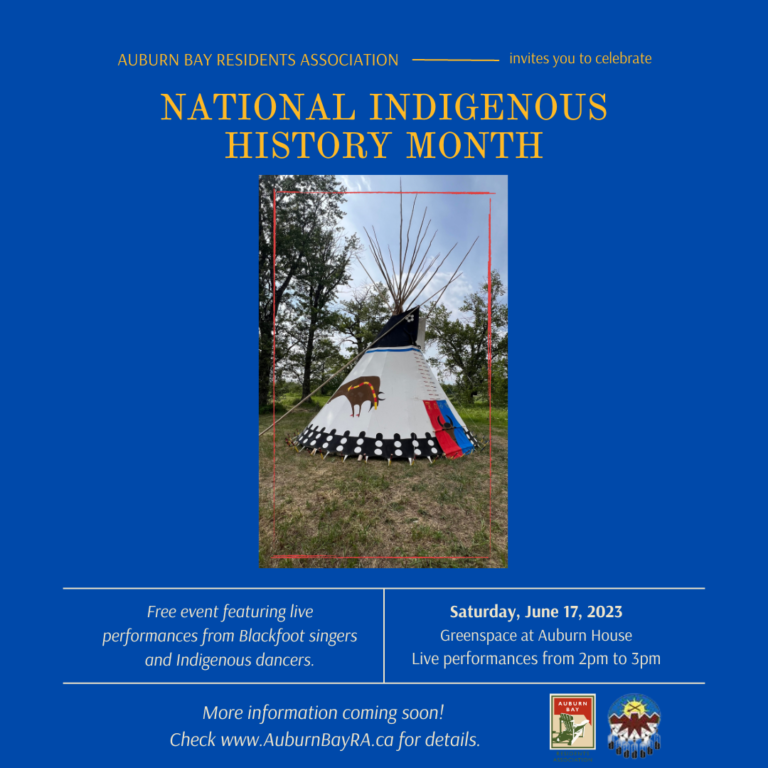 Join us at Auburn House on June 17th for a FREE event celebrating Indigenous History Month! We will have a beautiful Tipi set up in our green space, along with singers from the Blackfoot community and additional Indigenous dancers. This event is open to Auburn Bay residents and their guests so please come down to learn about Indigenous arts, culture, history and more!